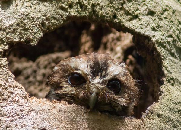 This small owl is reliant on other birds, such as woodpeckers, to help it find a place to nest! These owls nest in natural cavities found in trees, crevices and caves, but they also will lay their eggs in holes created by other species, such as woodpeckers!